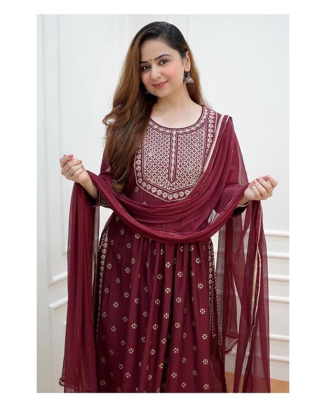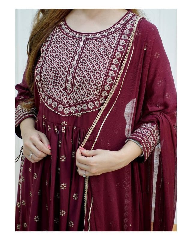 Chitra Creation Naira Cut Suit With Pant & Dupatta Set for Women Heavy Embroidery Work 3/4 Sleeves Pure Rayon Kurta For Girls Women (44, Maroon)