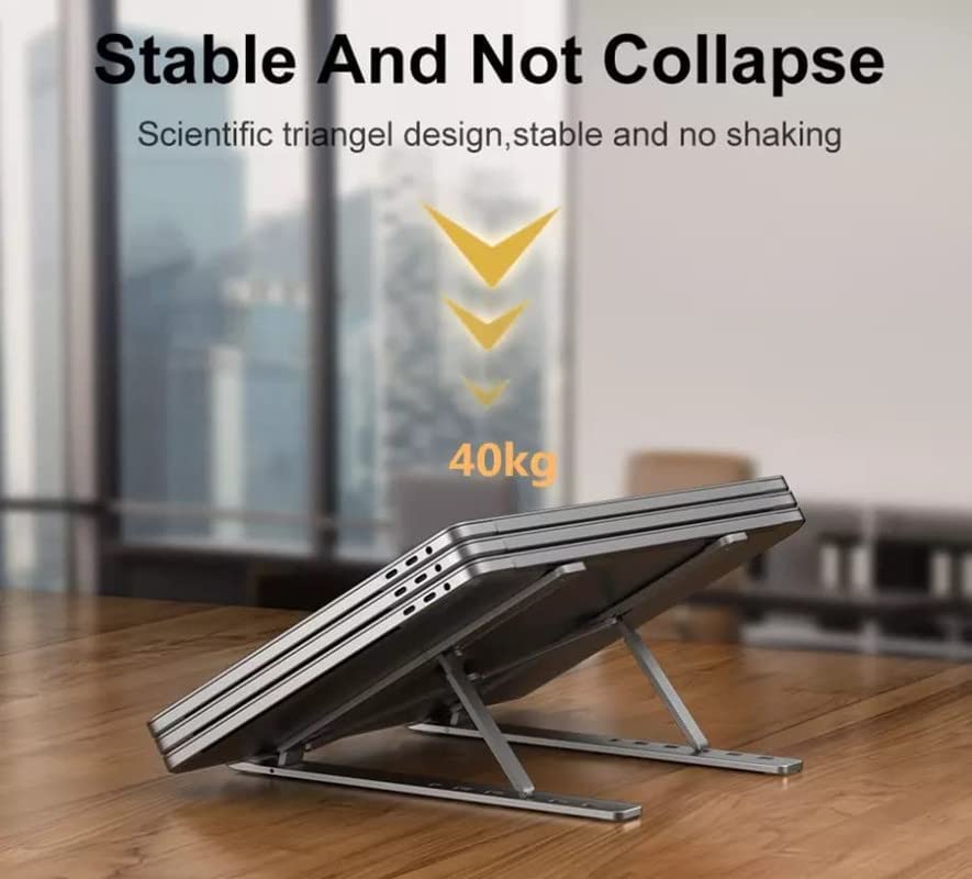 Laptop stand using the principle of triangular fixing and computer stand is made of premium aluminium alloy, the whole structure is very sturdy. There are no wobbles when you type on it. And can absorb and discharge heat easily. Supports up to 20 kg weight on top.