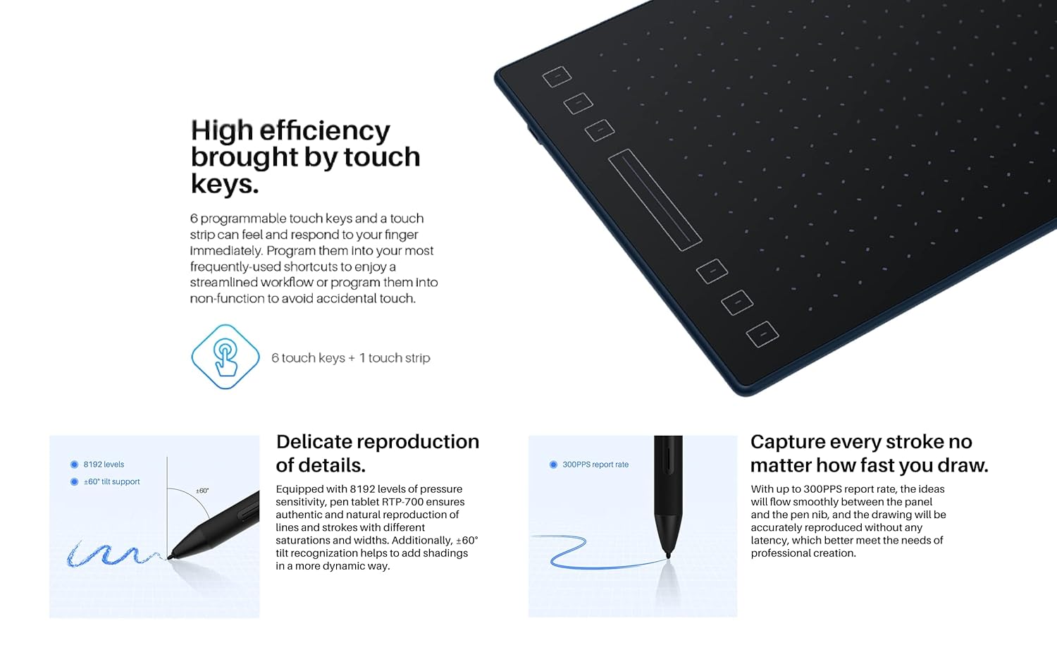 ( Tilt Support ) – Delicate reproduction of details- Equipped with 8192 levels of pressure sensitivity, pen tablet RTP 700 ensures authentic and natural reproduction of lines and strokes with different saturations and widths. Additionally, ±60° tilt support helps to add shadings more dynamically.