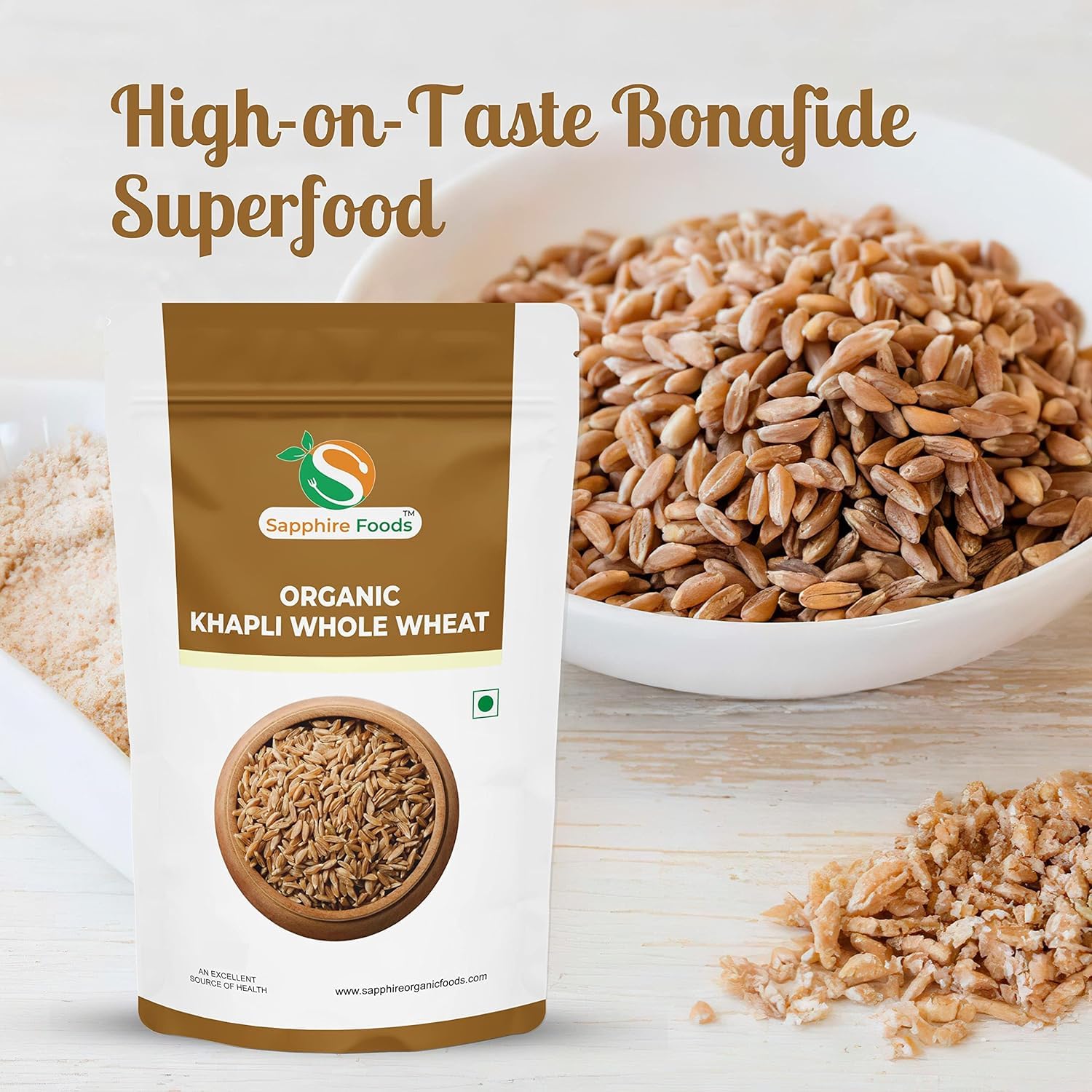 100 % Organic, Grown without synthetic Pesticides, Grown without synthetic GMOs, A unique combination of cereals, millets and legumes, Perfectly blended whole grains, Rich source of protein, A source of all essential amino acids, A good source of dietary fiber.Khapli wheat has complex carbs that can boost your immunity.6 KEY BENEFITS OF KHAPLI WHEAT: 1. Low Glycemic Index, 2. Rich in Fibre, 3. Easy to Digest, 4. Rich in Vitamins & Minerals, 5. Good source of protein, 6. Good source of anti-oxidants.