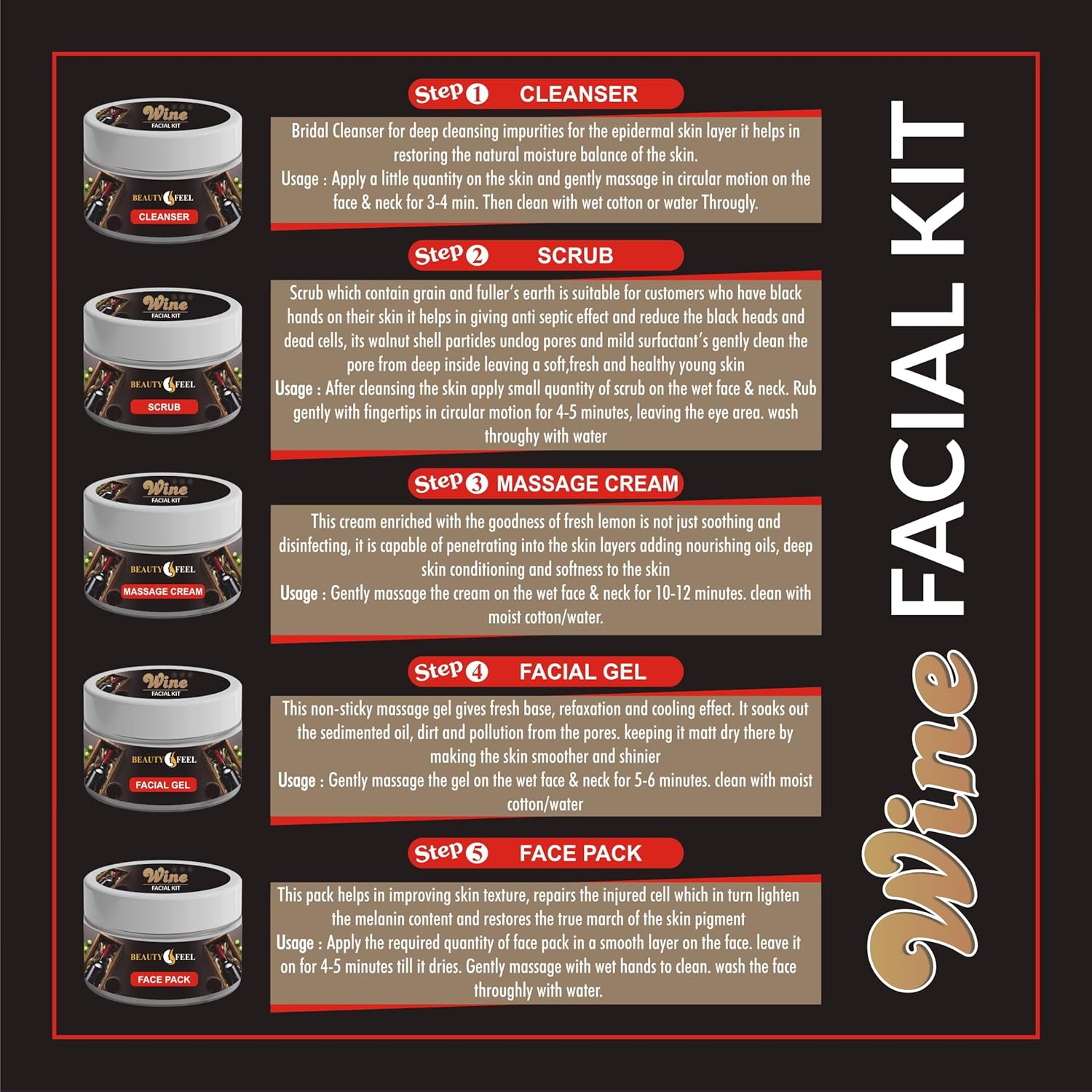 ![Professional Beauty Feel Red Wine Facial Kit With 5 in 1 Face Massager for Facial for Women & Men All Type Glow Fairness [ Set of 5 ] 275 gm Professional Beauty Feel Red Wine Facial Kit With 5 in 1 Face Massager for Facial for Women & Men All Type Glow Fairness [ Set of 5 ] 275 gm](https://m.media-amazon.com/images/I/81YKYSchheL._SL1500_.jpg)