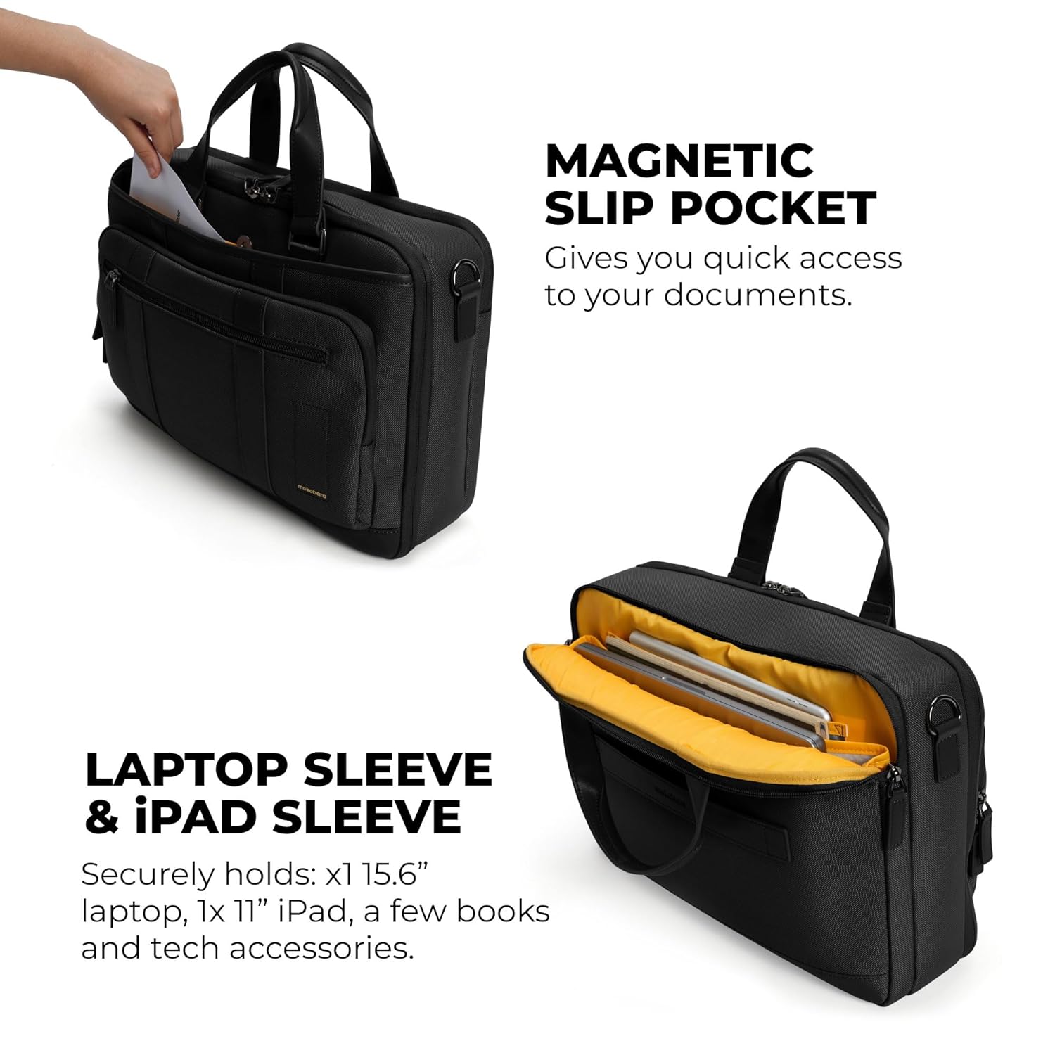 MOST FEATURE RICH BRIEFCASE: Suitcase compartment: Zippered mesh compartment that fits a change of clothes for up to 2 days, Spill-proof zippered pocket for toiletries, Dedicated tech compartment: Padded laptop sleeve, Fits up to a 15.6” laptop, iPad sleeve, Fits up to a 11” iPad, Front compartment: Pen pockets, Slip pockets.