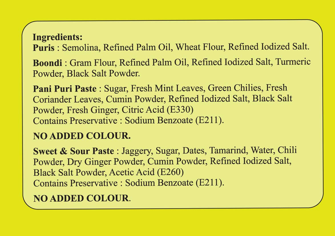 Package Contents : 30 individual Puris, 1 Pack of Boondi, 1 Pack of Pani Puri Paste & 1 Pack of Sweet and Sour Paste