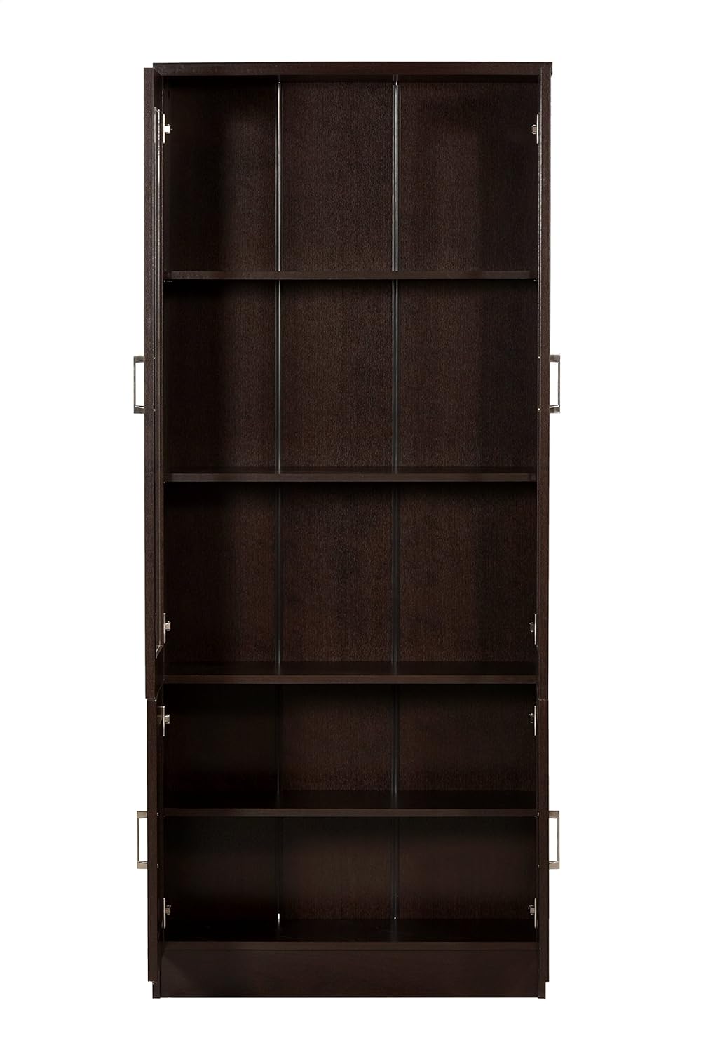 The 5-tier cabinet with spacious shelves and well-defined interiors provides sufficient storage space for multiple purposes. It features framed glass doors for sorting decorative and storing items.