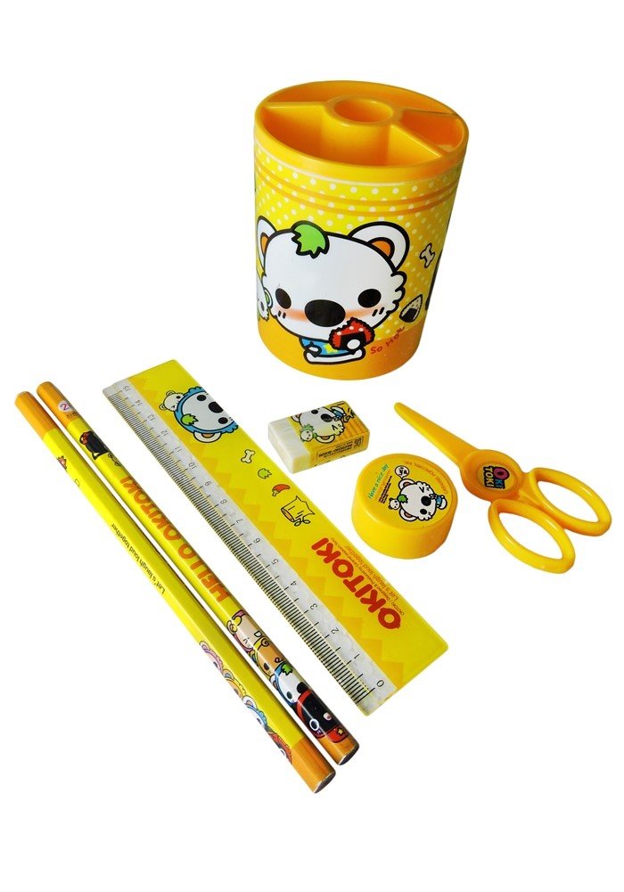 Includes 2 pencils,1 eraser,1 sharpner,1 paper cutting scissor,pen stand and scale.