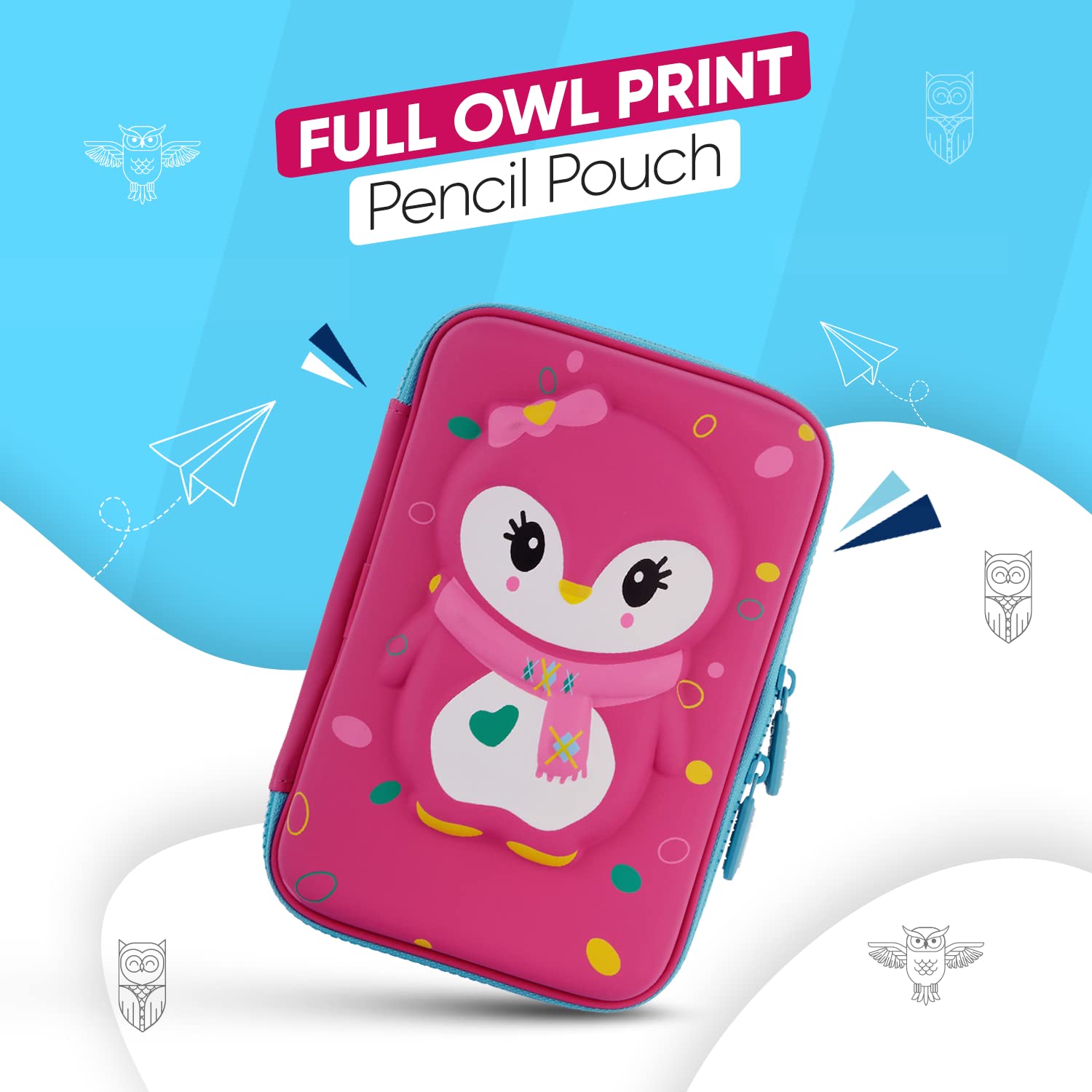 Ofsign 3D Stationery Items Organizer — Pencil Box for Girls & Boys, Geometry Pencil Case with Dual Zipper, Pencil Pouch with Mesh Pockets for Kid’s Gift – School (Owl Art, Pink)