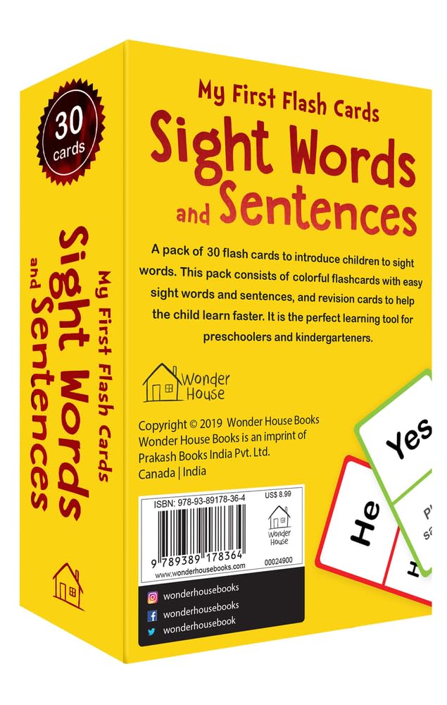 A pack of 30 Flash cards to introduce the young learners to basic sight words like “please”, “look”, “there”, and others. This pack consists of attractive and colorful flashcards with different sight words and sentences, which help in developing the visual learning skills, reading skills and a robust vocabulary of a child. Revision cards help the child learn faster. It is a wonderful learning tool for pre-schoolers and kindergarteners.
